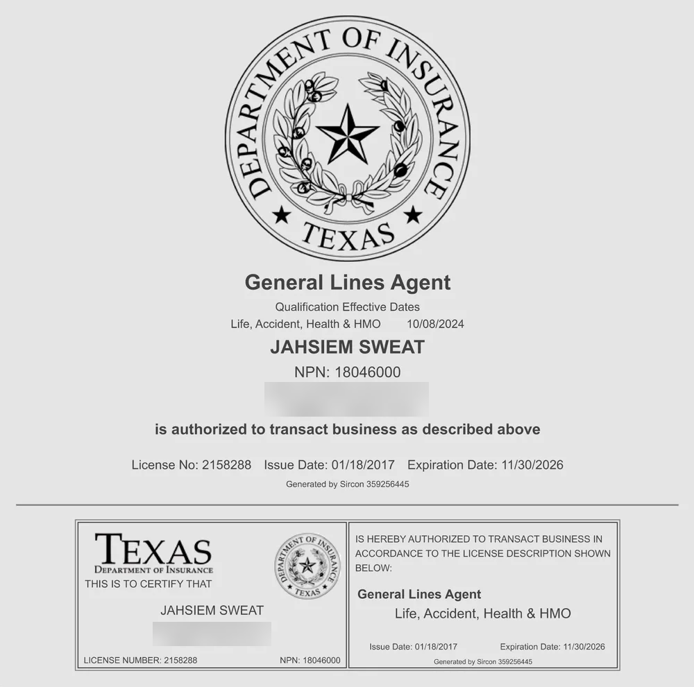 This license authorizes Jahsiem "Jay" Sweat to sell, solicit, and service Life, Health, Accident, and HMO insurance products in the state of Texas. It demonstrates proven knowledge of insurance regulations, product structures, ethical standards, and consumer protection requirements.